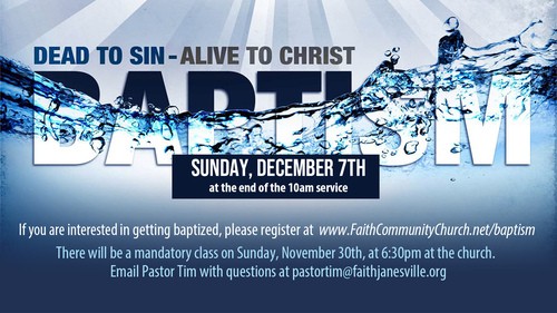 - A mandatory baptism class will be held the week prior on Sunday, November 30th at 6:30 PM in the classroom at the church.