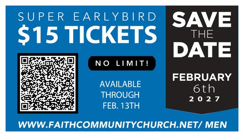 Join us on Saturday, February 6th, from 7:30am until 2pm for No Regrets 2027. We have our SUPER EARLYBIRD tickets on sale now through February 13th for just $15. This will be the lowest price available. There's no limit on how many you can purchase, so grab a few for your friends and invite your neighbor! Thank you for supporting this ministry to men. We look forward to seeing you again next year!