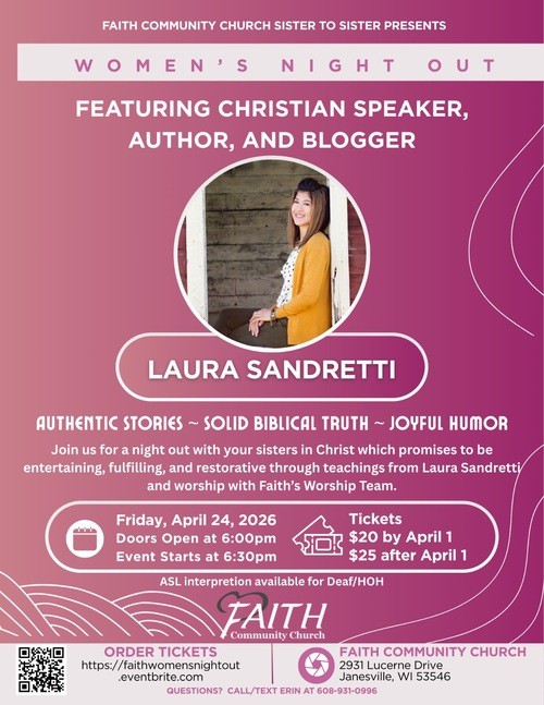Join us for a fun in-person evening with author, speaker, and blogger Laura Sandretti and the Faith Community worship team! Gather your friends and come ready to laugh, learn, worship and-Lord willing- experience God's love in new and meaningful ways!